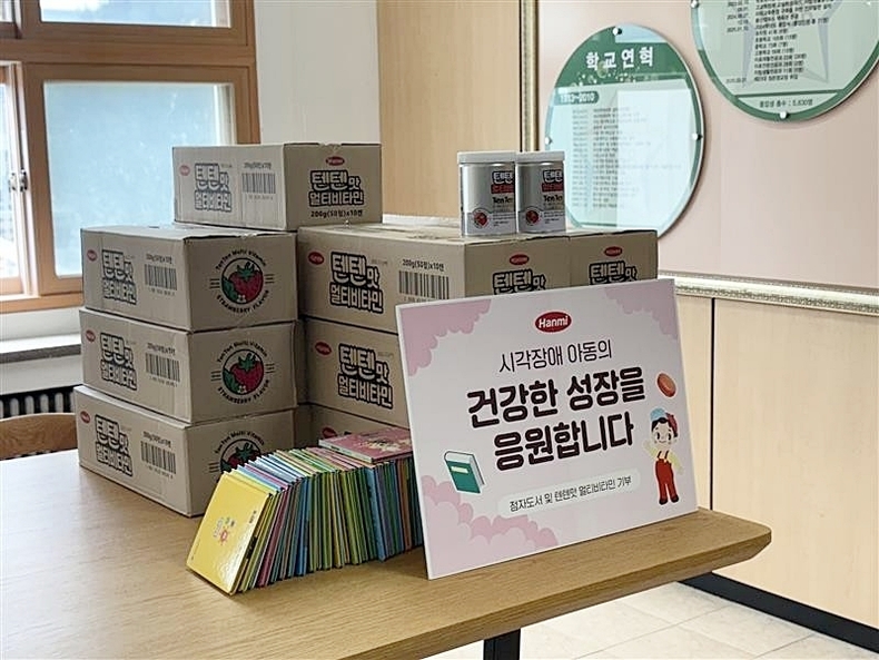 시각장애 아동을 위해 우리나라 최초의 맹학교인 국립서울맹학교에 한미 임직원들은 직접 제작한 점자도서 30권과 텐텐맛 멀티비타민 150통을 전달하며 아이들의 학습과 건강을 응원했다.