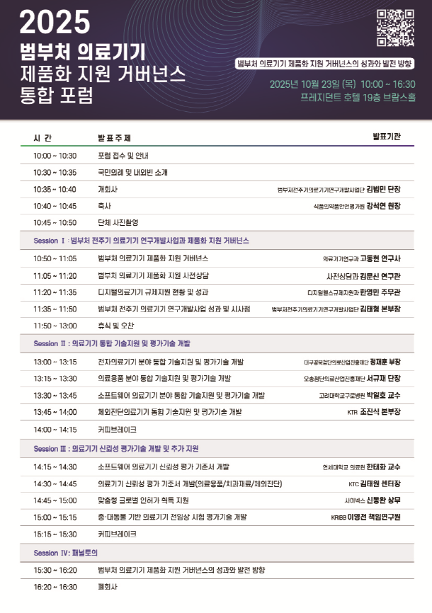 범부처전주기의료기기연구개발사업단(단장 김법민, 이하 사업단)은 식품의약품안전처(처장 오유경) 식품의약품안전평가원과 함께 10월 23일(목), 프레지던트호텔(서울 중구)에서 ‘2025 범부처 의료기기 제품화 지원 거버넌스 통합포럼’을 개최한다.