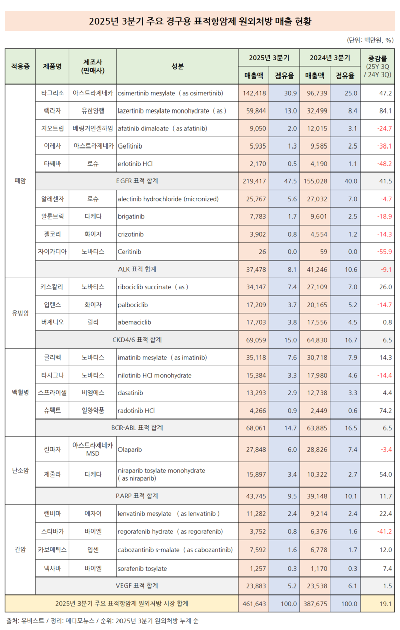 의약품 시장조사기관 유비스트에 따르면 주요 경구용 항암제들은 2024년 3분기 3876억원에서 2025년 3분기 4616억원으로 19.1% 상승곡선을