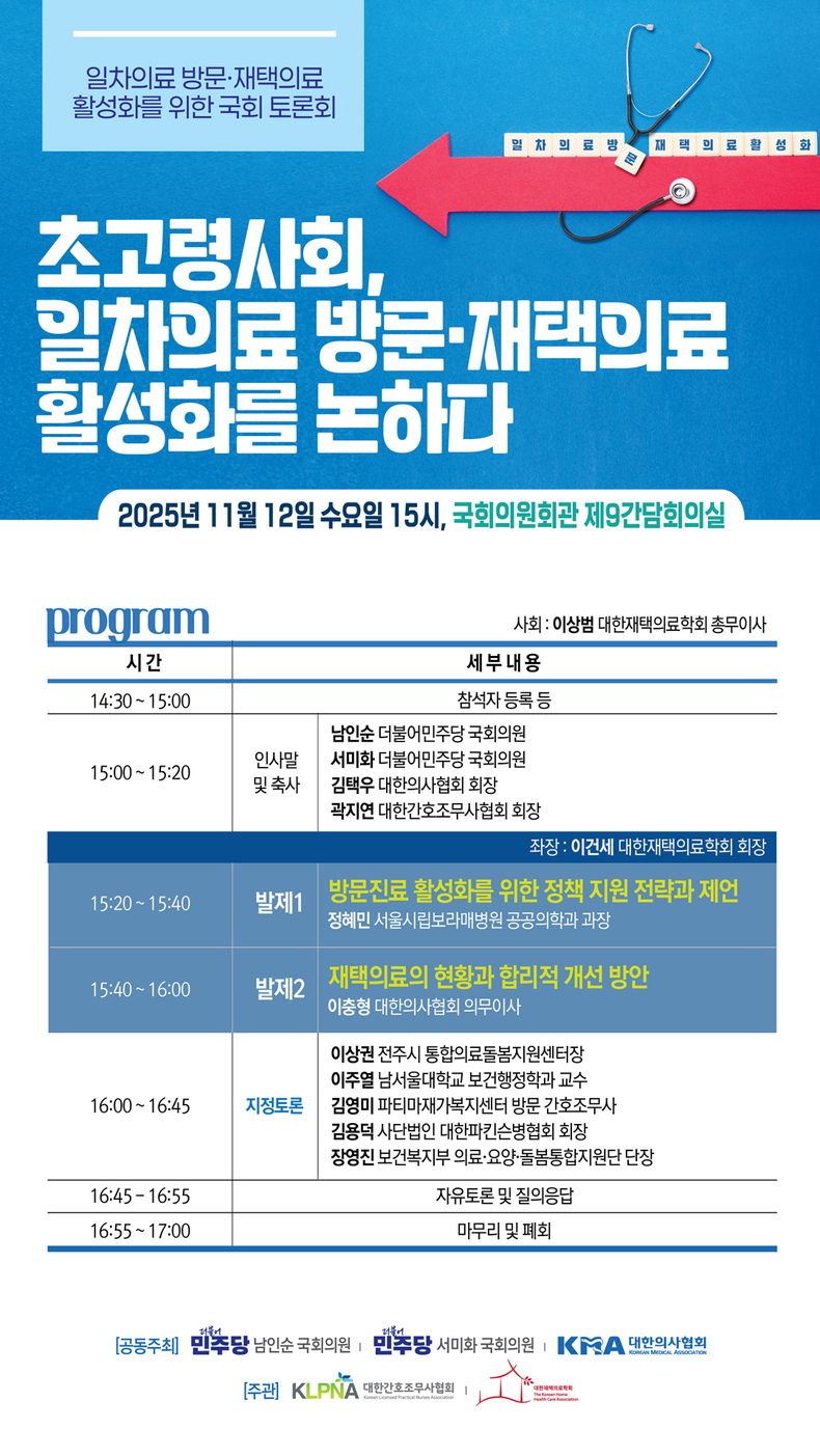 이번 토론회는 더불어민주당 남인순 국회의원, 서미화 국회의원과 대한의사협회가 공동으로 주최하고, 대한간호조무사협회와 대한재택의료학회가 함께 주관한다. 초고령사회에 진입한 대한민국의 의료·돌봄 체계를 보다 촘촘하게 구축하기 위한 정책 해법 모색의 장으로 보건의료계, 돌봄계, 환자단체, 정부 관계자들이 한자리에 모인다.