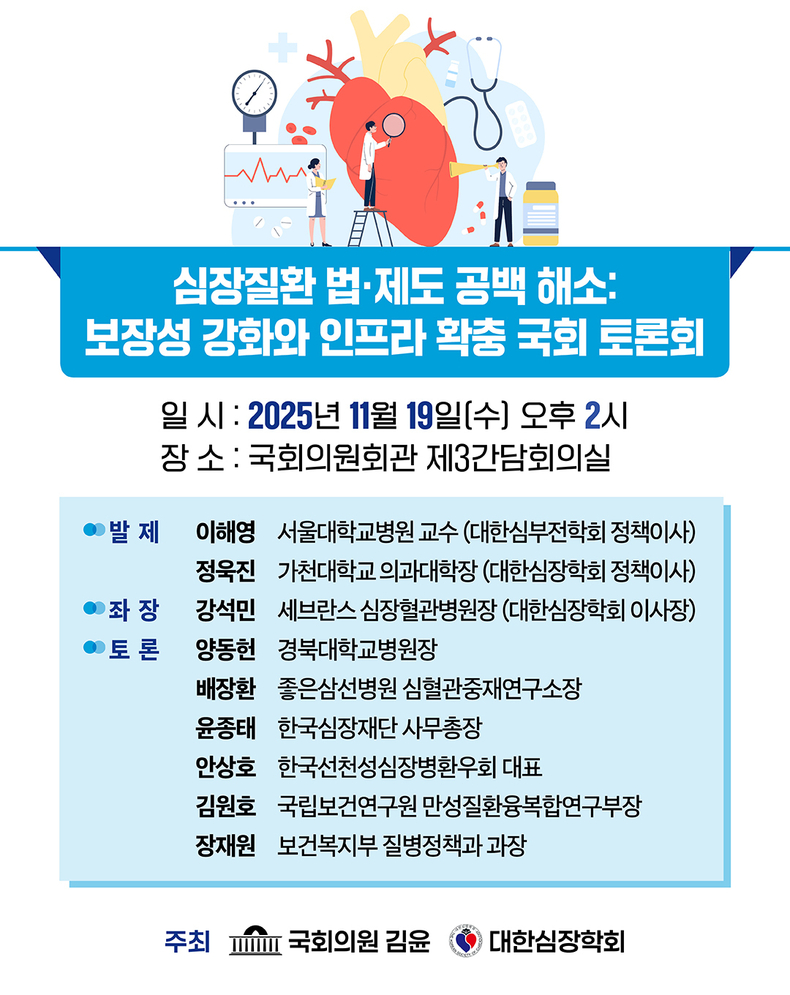 대한심장학회(이사장 강석민 세브란스 심장혈관병원장)는 11월 19일(수) 오후 2시 국회의원회관 제3간담회실에서 더불어민주당 김윤 의원과 함께 ‘심장질환 법·제도 공백 해소: 보장성 강화와 인프라 확충’ 국회 토론회를 공동주최한다.