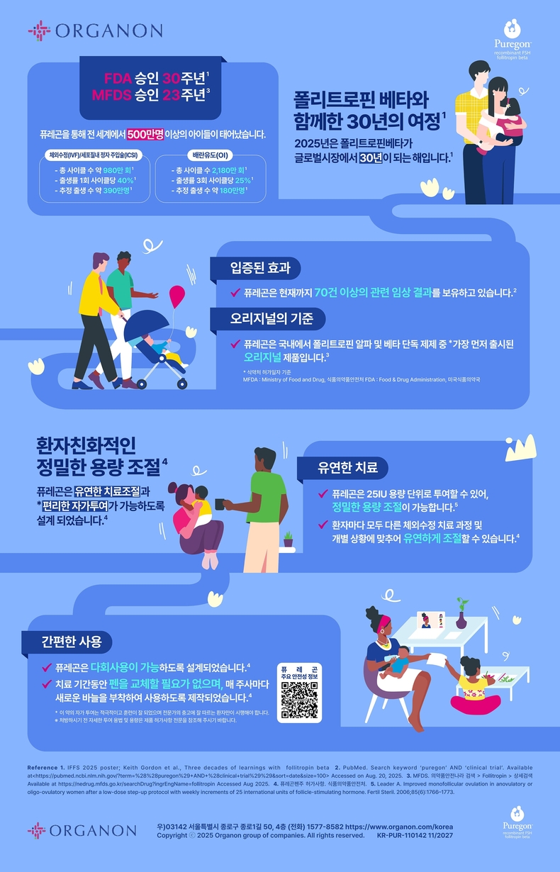 한국오가논(대표 김소은)은 지난 11월 11일 ‘난임가족의 날’을 맞아, 지난 30년간 전 세계 500만명의 탄생을 도운 난임 치료제 ‘퓨레곤펜주(성분명: 폴리트로핀 베타, 이하 퓨레곤)’ 의 임상적 가치를 알리는 인포그래픽을 공개했다.
