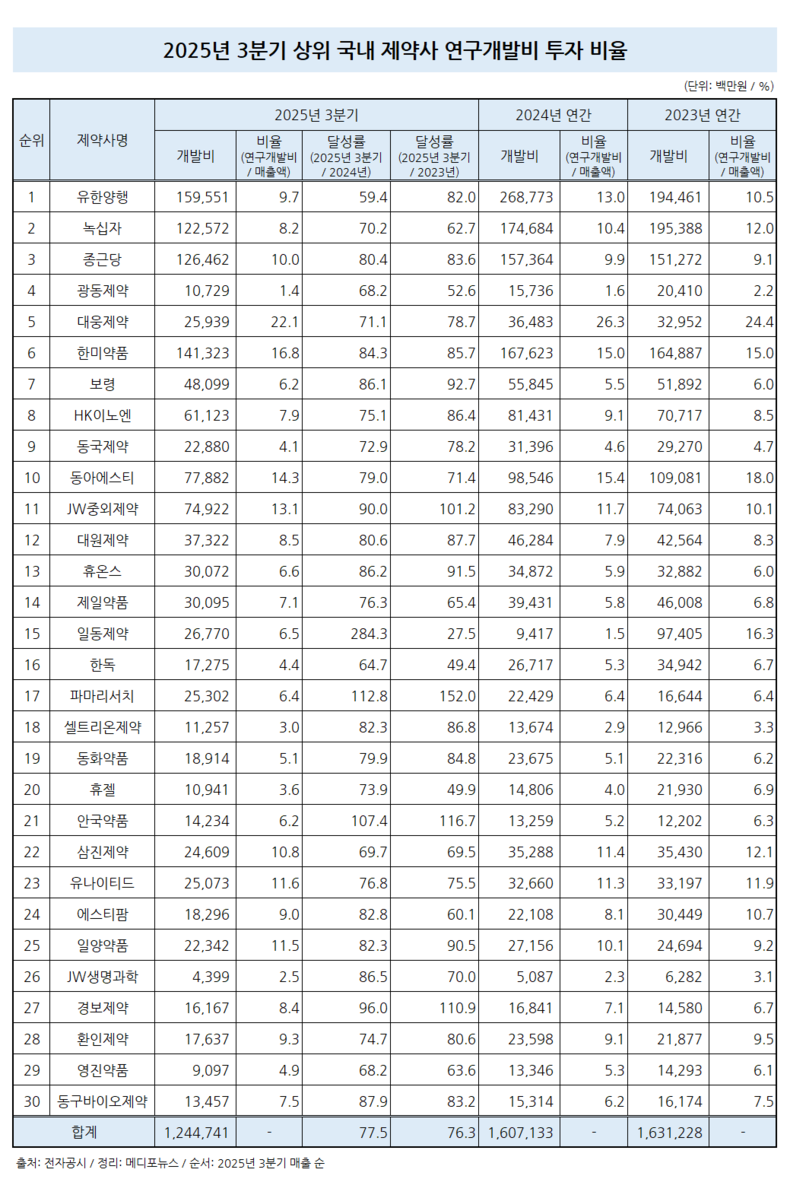 2025년 3분기 주요 국내제약사들의 분기보고서를 분석한 결과 대웅제약이 가장 연구개발비 투자 비율이 높은 것으로 나타났다.