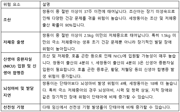 다태 임신은 임산부에게 여러 합병증 위험을 높이는 것으로 나타났다. 쌍둥이 임신은 단태 임신보다 ▲조산 및 조기 진통 위험 6배 ▲임신중독증 위험 2배 이상(세쌍둥이는 9배) ▲산후출혈 위험 약 3배 ▲혈전성 질환 위험 3배 등 다양한 합병증 위험이 증가한다. 임신·출산 과정의 어려움뿐 아니라 출산 후 육아 스트레스와 경제적 부담도 단태아보다 훨씬 클 수 있다.