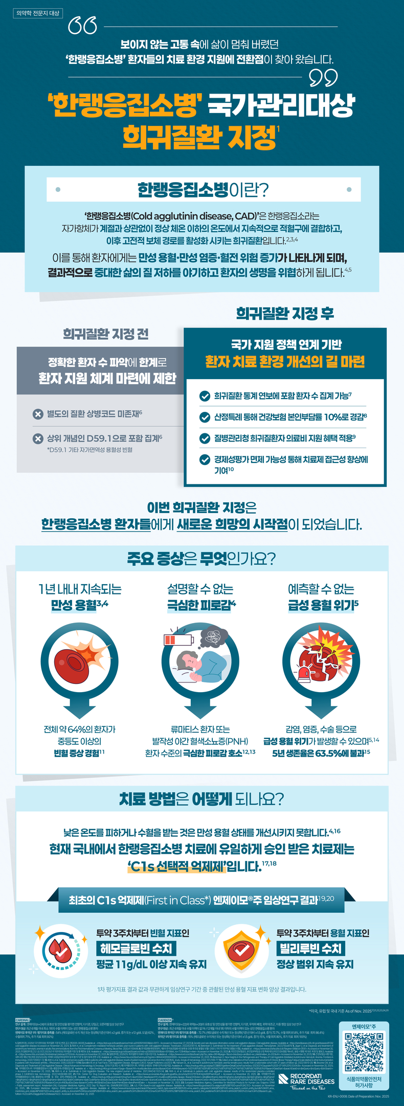 레코르다티코리아가 지난 27일 질병관리청으로부터 국가관리대상 희귀질환으로 지정된 ‘한랭응집소병(Cold Agglutinin Disease, CAD)’ 인식 제고를 위한 인포그래픽을 1일 공개했다. 이번 인포그래픽에는 한랭응집소병에 대한 소개와 주요 증상, 치료 방법, 그리고 국가관리대상 희귀질환 지정으로 기대되는 치료 환경 개선에 대한 내용이 담겼다.