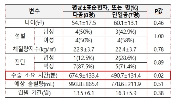 연구 결과, 단일공 수술을 받은 실험군 수술 시간이 다공 수술을 받은 대조군에 비해 유의미하게 짧았다는 결과값(490.7±131.4분 vs. 674.9±133.4분, p=0.02)을 얻어냈다.