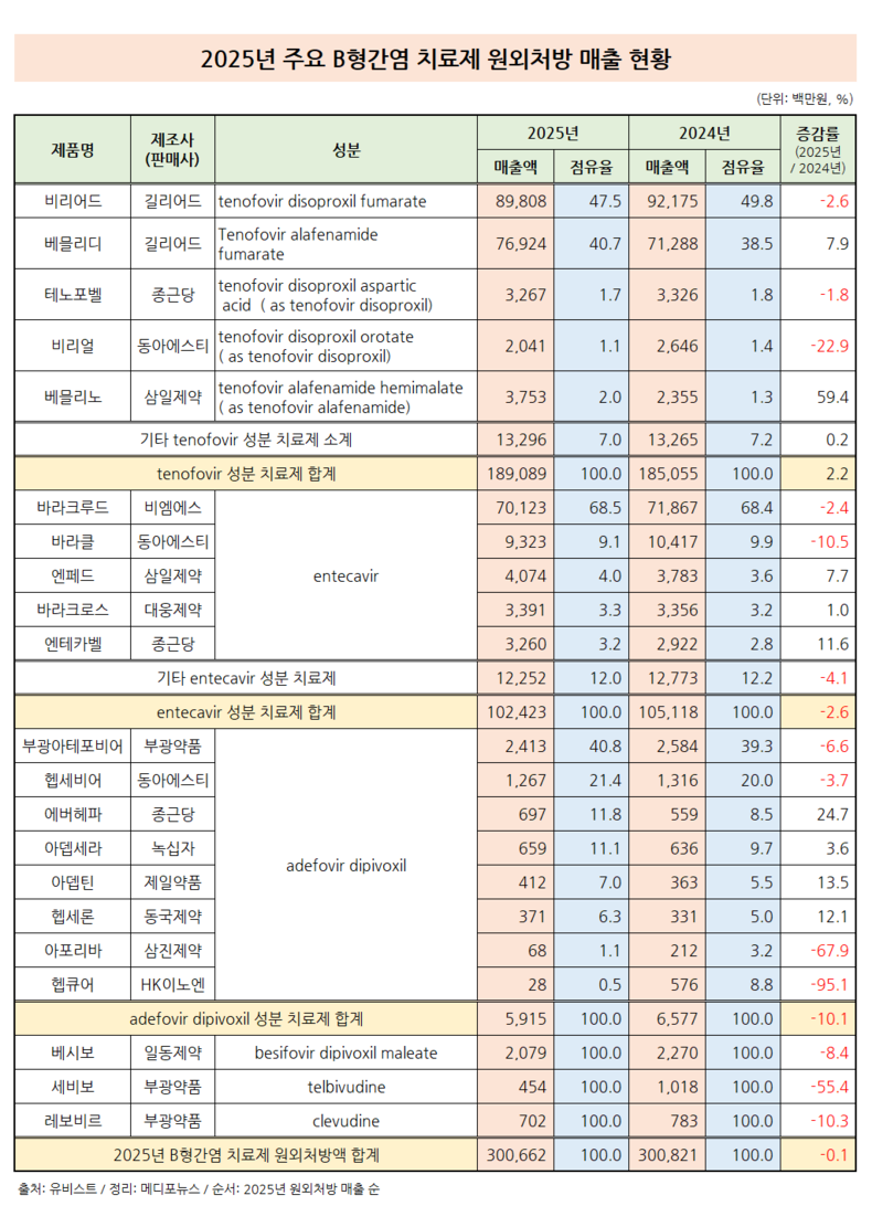2025년 3분기 조금이나마 성장하는 것처럼 보였던 주요 B형간염 치료제 시장이 결국 0.1% 감소한 채로 마무리됐다.
