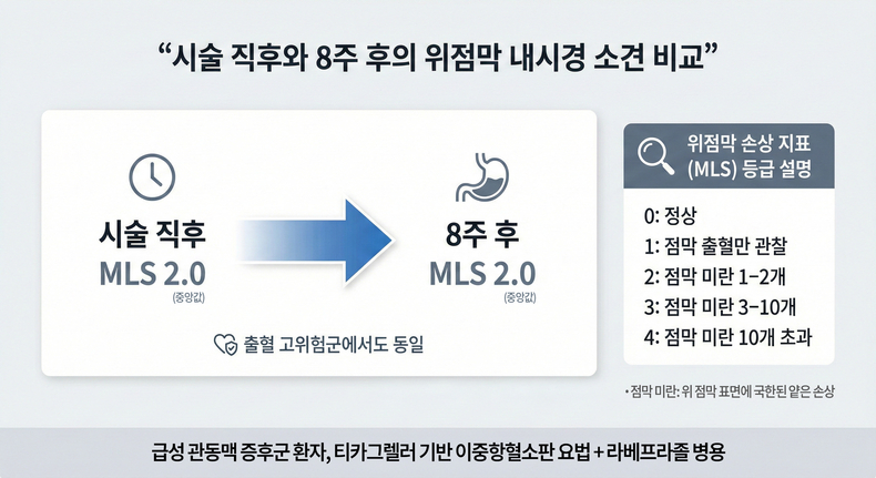 그 결과, 라베프라졸 복용 8주 후 MLS 중앙값은 2.0으로 시술 직후와 동일하게 유지됐으며, 위점막 손상의 유의한 악화는 관찰되지 않았다. 이러한 경향은 출혈 고위험군에서도 같았다. 또한 위식도 역류 질환 및 소화불량 관련 증상을 나타내는 지표에서도 유의한 변화가 없었으며, 심각한 출혈이나 주요 심혈관 사건은 발생하지 않았다.