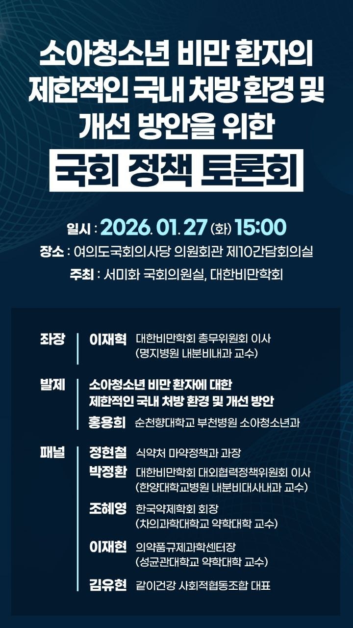 비만학회는 “소아·청소년 고도비만은 단순한 체중 문제를 넘어 평생 건강에 영향을 미치는 질환”이라며 “임상 현장과 제도 사이의 간극을 좁히고, 환자 안전을 최우선으로 한 합리적인 치료 논의의 출발점이 되길 기대한다”고 밝혔다.