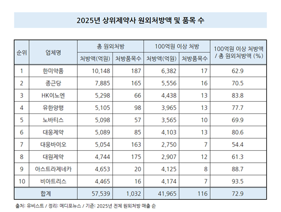 의약품 시장조사기관 유비스트 자료를 분석한 결과, 2025년 원외처방 상위 10개사에서 100억원 이상을 달성한 제품들은 총 116개로, 해당 제약사들의 총 원외처방액인 5조 7539억원의 72.9%인 419억원 규모를 차지했다.