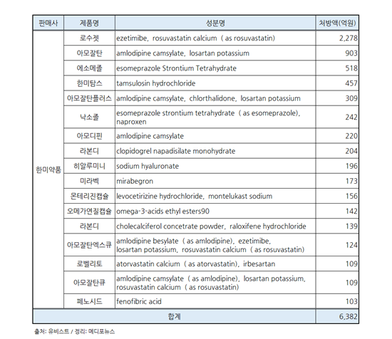 로수젯이 2278억원으로 압도적인 원외처방액을 보인 가운데, 아모잘탄이 903억원, 에소메졸이 518억원, 한미탐스가 457억원, 아모잘탄플러스가 309억원, 낙소졸이 242억원, 아모디핀이 220억원, 라본디가 204억원을 달성했다.
