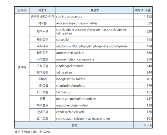 종근당은 165개 품목 중 16개 품목이 100억원 이상으로 확인됐다. 특히 종근당의 블록버스터 제품들은 총 5556만원 규모로 회사 원외처방액의 70.5%였다.