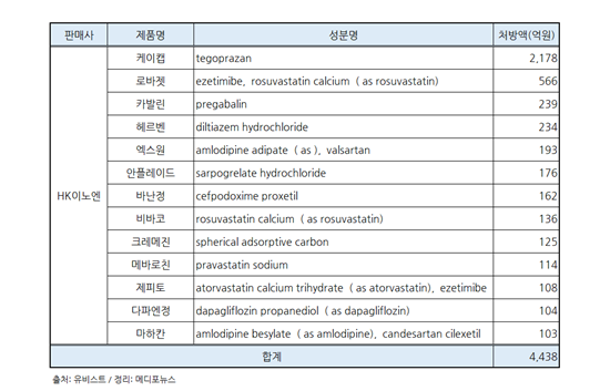 HK이노엔은 66개 제품 중 13개 품목이 블록버스터 제품이었다. 이 제품들의 원외처방액은 총 4438억원이었는데, 회사 원외처방액의 83.8%로 높은 비중을 차지하고 있다.