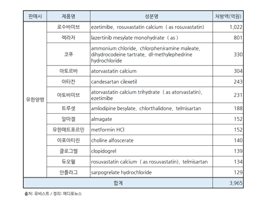 유한양행의 제품 중 로수바미브가 1022억원으로 처방액이 가장 높았고, 렉라자는 801억원, 코푸는 330억원, 아토르바는 304억원, 아타칸은 243억원, 아토바미브가 231억원을 기록했다.