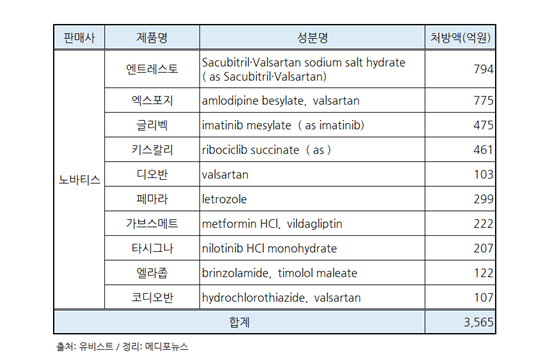 노바티스는 자사 57개 품목 중 10개 품목이 블록버스터로, 회사 원외처방액인 5098억원에서 69.9%인 3565억원이 블록버스터 제품들의 원외처방액이었다.