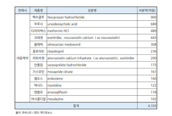 대웅제약은 85개 품목 중 13개 품목이 블록버스터였는데, 이 제품들은 원외처방은 회사 매출의 80.6%인 4103억원 규모로 확인됐다.