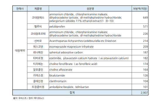 코대원에스가 649억원, 펠루비가 571억원, 코대원포르테가 226억원, 신바로가 214억원, 에스코텐이 209억원, 레나메진이 187억원, 타바로젯이 182억원, 티지페논이 174억원, 알포콜린이 164억원, 카덱스정이 126억원, 클래신정이 104억원, 트윈콤비정이 101억원을 달성했다.
