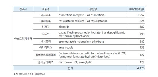 아스트라제네카는 20개 제품 중 8개 제품이 블록버스터로 나타났다. 특히 아스트라제네카는 회사 매출이 4653억원인제, 블록버스터 제품들의 원외처방액 합계가 4125억원으로 88.7%를 견인하고 있다.