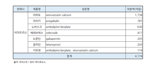 비아트리스는 상위 10개사 중 블록버스터 제품들의 원외처방 견인 비율이 가장 높다. 16개 제품 중 7개 제품이 블록버스터 제품이었는데, 회사 원외처방액은 4465억원, 블록버스터 제품 원외처방액 합계는 4174억원으로 약 93.5%를 차지했다.