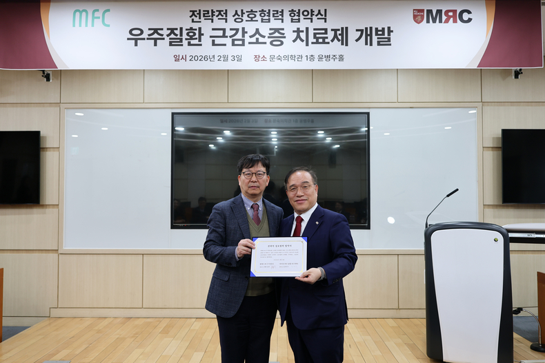 고려대학교 의과대학 마이오카인 융합 연구센터(Center for Myokine convergence Research, 센터장 고려대 의대 해부학교실 김현수 교수)와 엠에프씨가 지난 3일 우주인 근감소증 치료제 공동개발을 위한 업무협약을 체결했다고 밝혔다.