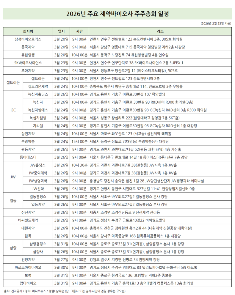 또 26일 9시 신신제약이 세종 신신제약 관리동에서, 비씨월드제약이 성남 비씨월드빌딩에서 주주총회를 개최한다고 공시했으며, 10시에는 대원제약이 진천공장에서, 한독이 마곡 한독퓨처콤플렉스에서 주주총회를 열겠다고 밝혔다.