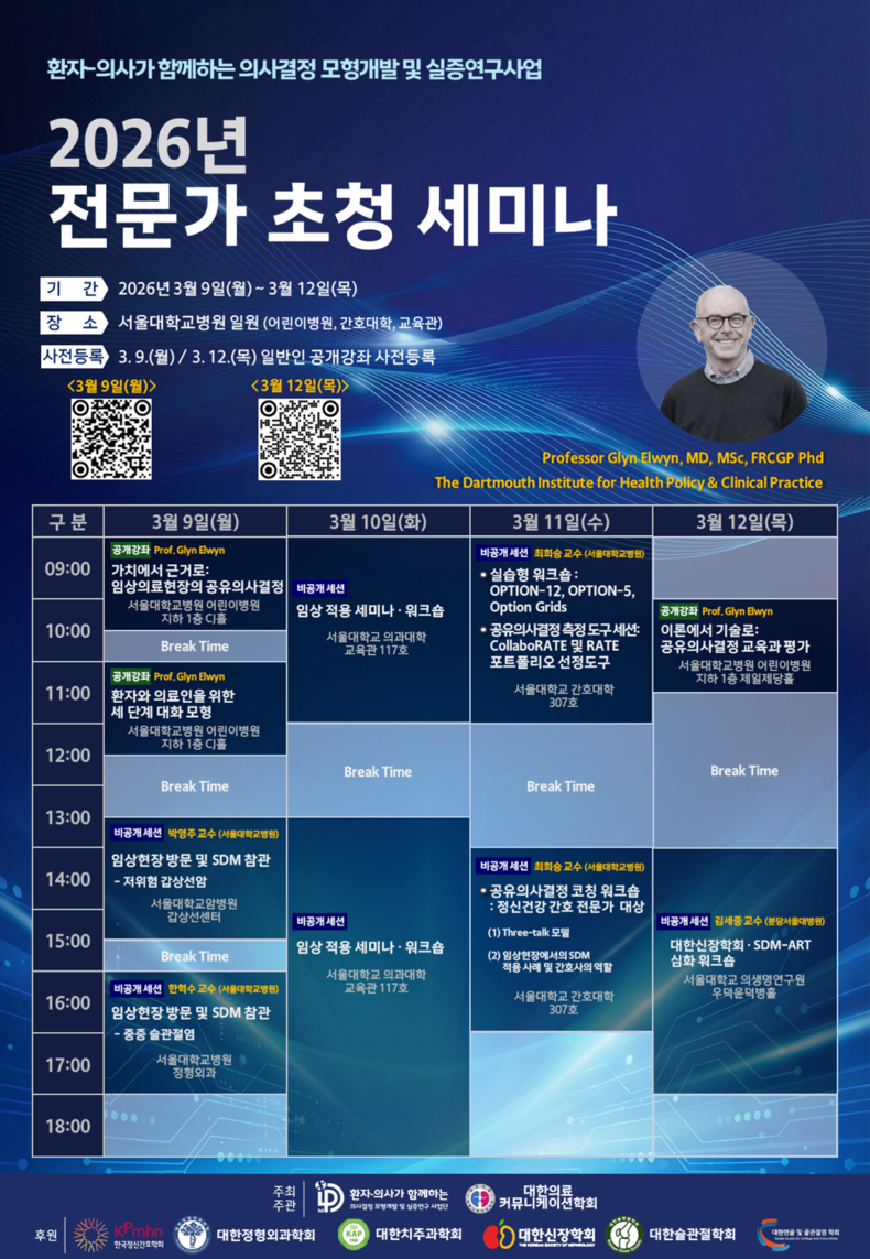 공개강좌는 공유의사결정 분야의 세계적 석학인 다트머스 대학교(Dartmouth College) 글린 엘린(Glyn Elwyn, MD, PhD) 교수가 초청돼, 3월 9일과 12일 이틀에 걸쳐 공유의사결정의 이론적 모형과 국내 의료 현장 적용을 위한 주요 쟁점과 과제를 집중적으로 소개한다.
