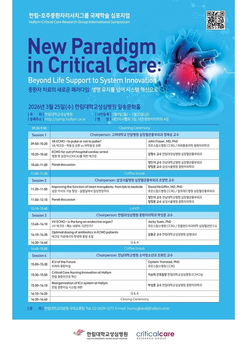 한림대학교성심병원은 오는 3월 25일 한림대학교성심병원 일송문화홀에서 호주중환자리서치그룹(Critical Care Research Group, CCRG)과 함께 ‘중환자 치료의 새로운 패러다임: 생명 유지를 넘어 시스템 혁신으로(New Paradigm in Critical Care: Beyond Life Support to System Innovation)’를 주제로 ‘한림대학교성심병원-호주중환자리서치그룹 국제학술 심포지엄’을 개최한다.