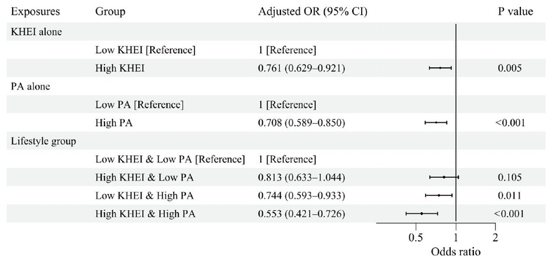 연구팀은 우울증 진단 환자를 제외한 일반 성인을 대상으로 식사의 질(한국인 건강 식생활 지수, KHEI)과 주간 신체 활동량(PA)을 산출하고, 우울 증상 선별도구(PHQ-9) 10점 이상 여부를 확인했다. 이후 대상자를 외부 요인 보정 후 ▲둘 다 부족한 그룹 ▲식사 질만 높은 그룹 ▲운동만 활발한 그룹 ▲둘 다 높은 그룹 등 4가지로 나눠 각 그룹 간의 ‘우울 증상 발생 위험’ 차이를 분석했다.
