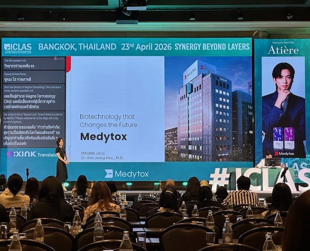 행사 둘째 날인 23일, 메디톡스는 태국 현지법인 ‘메디톡스 타일랜드’와 함께 국제 학술대회 ‘ICLAS 2026’ 인더스트리얼 세션에 참가해 한국, 일본, 태국 연자들의 임상 경험을 바탕으로 최신 시술 지견을 발표하며 학술적 교류를 이어갔다.