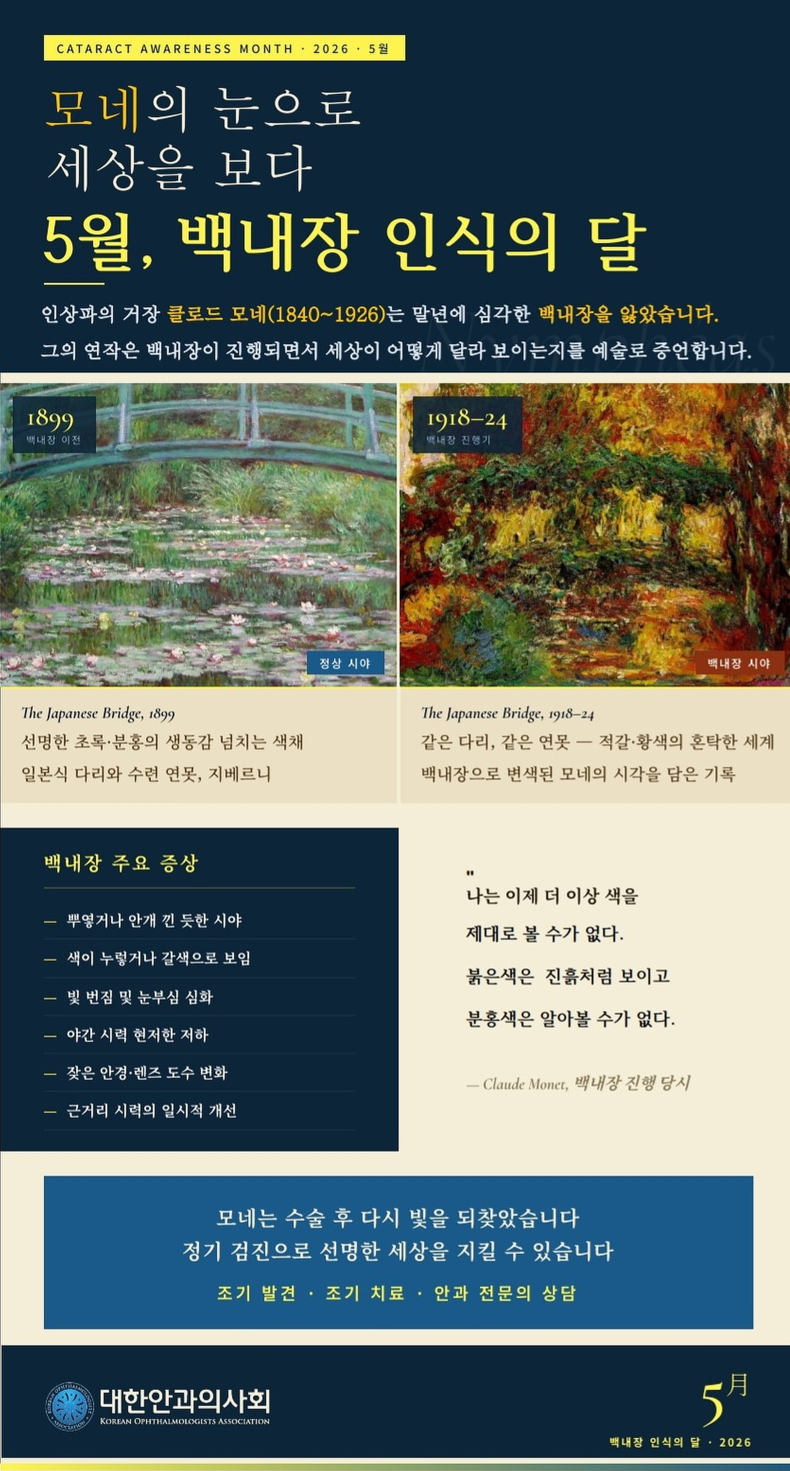 정혜욱 회장은 “초고령 사회를 목전에 둔 지금, 백내장의 조기 발견과 적기 치료는 노년층의 독립적인 일상과 삶의 질을 지키는 핵심 과제”라고 강조하며, “이번 캠페인을 통해 백내장을 자연스러운 노화로만 여겨 방치하지 않고, 안과 전문의와 함께 정기적으로 눈 건강을 돌보는 문화가 우리 사회에 깊이 뿌리내리기를 기대한다”고 밝혔다.