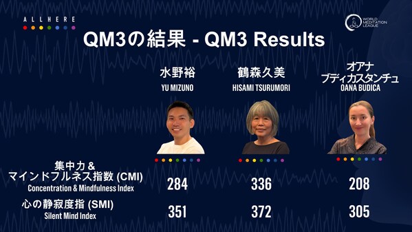 챌린지 참가자인 오아나 부디카스탄쿠(Oana Budicastancu), 츠루모리 히사미(Hisami Tsurumori), 미즈노 유(Yu Mizuno)씨 중 츠루모리씨가 가장 높은 QM3™ 점수를 기록했다. 그녀는 "20년 전 질병에 걸린 일을 계기로 명상을 시작한 뒤 매일 수행해왔다"면서 "삶에서 스트레스와 불안을 느끼는 분에게 명상이 내게 그랬듯 내적 평화를 가져다주길 바란다"고 전했다.
