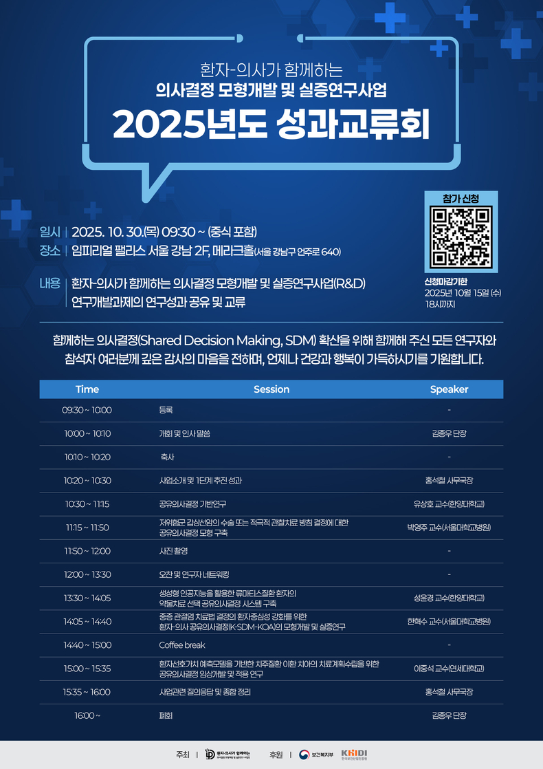 이어 오찬 이후 진행되는 2부에서는 ▲류마티스 질환 약물치료 선택 공유의사결정 시스템 구축(성윤경 교수, 한양대학교) ▲중증 관절염 치료법 결정의 환자 중심성 강화를 위한 K-SDM-KOA 모형 개발(한혁수 교수, 서울대학교병원) ▲치주질환 치료계획을 위한 공유의사결정 임상모형 개발(이중석 교수, 연세대학교) 발표가 진행된다.