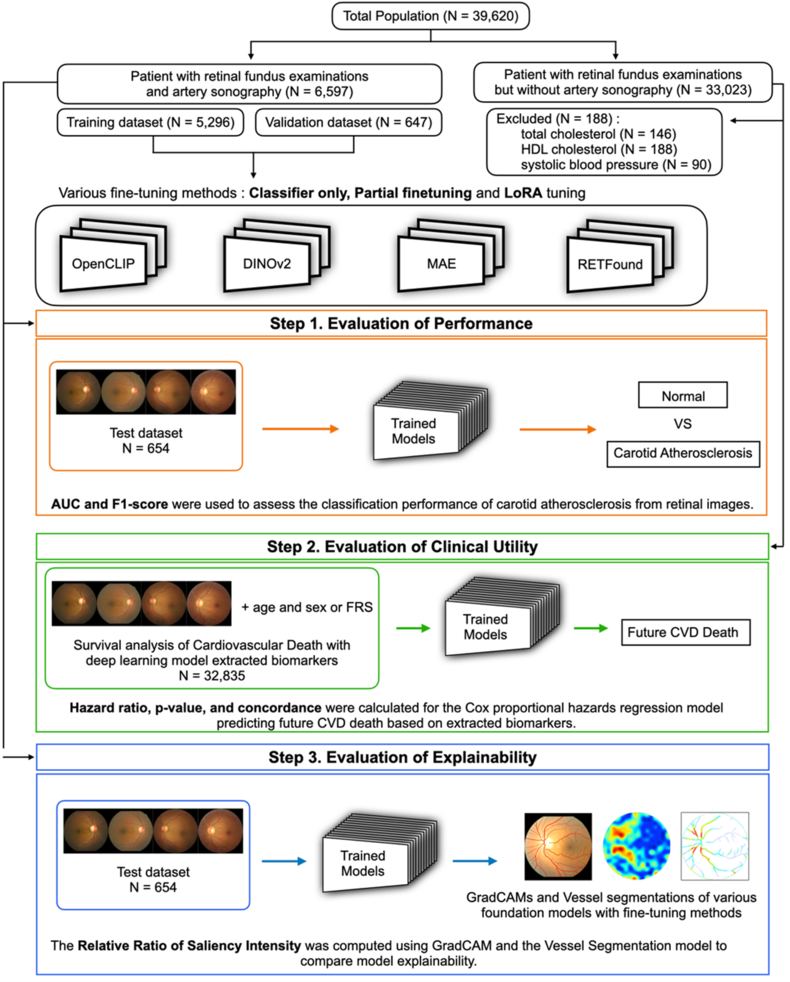 반면, 안저사진은 건강검진을 포함한 다양한 의료 현장에서 이미 널리 촬영되고 있는 비침습적 검사로, 별도의 부담 없이 쉽게 얻을 수 있다. 연구팀은 이러한 점에 주목해, 안저사진을 활용해 경동맥경화를 조기에 발견할 수 있는 기회검진(opportunistic screening) 인공지능 모델을 대규모 데이터로 사전 학습된 파운데이션 모델을 활용해 개발했다.