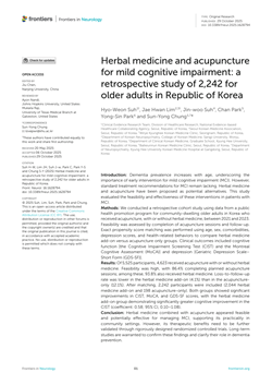 이번 연구는 한의원과 보건소를 통해 프로그램에 참여한 60세 이상 경도인지장애(Mild Cognitive Impairment, MCI) 노인 총 5525명 중 침치료 및 사후평가를 완료한 2242명을 대상으로, 한약과 침치료의 병행이 인지기능 및 우울 지표에 미치는 영향을 평가하기 위해 이뤄졌다.