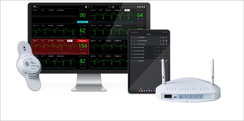 에이티모니터링은 2등급 의료기기인 ‘환자 중앙감시장치’로, 입원환자의 심전도(ECG)와 낙상을 실시간 통합 모니터링한다. 자사의 웨어러블 홀터 심전도 기기 ‘에이티패치(AT-Patch)’에서 수집된 생체신호는 부정맥 알람 기능이 있는 전용 모니터링 뷰어로 전송되어 의료진이 병상 단위로 환자의 상태를 한눈에 확인하고 이상 징후 발생 시 즉시 대응할 수 있다.