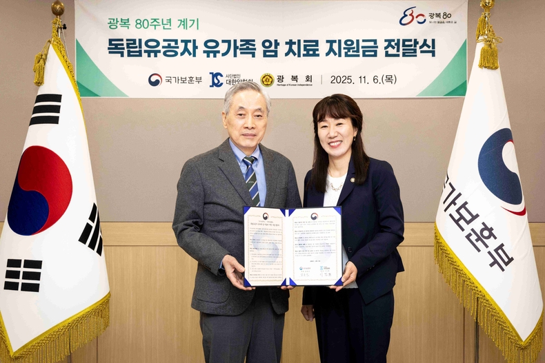 대한암협회(회장 이민혁)는 2025년 11월 6일(목) 오후 서울지방보훈청에서 국가보훈부(장관 권오을)와 ‘독립유공자 유가족 암 치료비 지원’을 위한 업무협약을 체결하고 지원금 전달식을 진행했다.