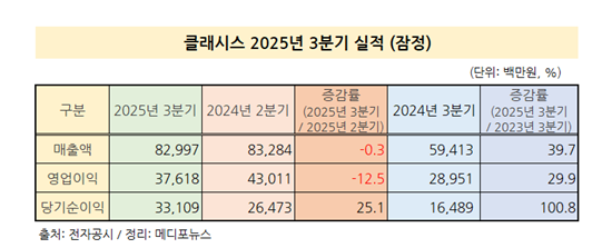 클래시스는 10일 공시를 통해 3분기 연결 매출액 830억원, 영업이익 376억원을 기록했다고 밝혔다. 이는 전년 동기 대비 각각 40%, 30% 증가한 수치다. 3분기 누적 매출액은 2434억원으로 이미 전년도 연간 실적 2429억원을 넘어섰다. 영업이익률은 일부 이월된 마케팅 비용이 집중되며 일시적으로 소폭 하락했으나, 매출 규모 성장과 함께 증가하고 있다.