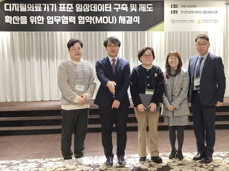 양 기관은 디지털의료기기 표준 임상데이터 구축 및 검증 가이드라인의 공동 개발·적용·확산, 임상데이터 품질관리 및 인공지능 학습·검증 데이터셋에 대한 기술적·임상적 검토 지원 등을 주요 협력 분야로 설정했다.
