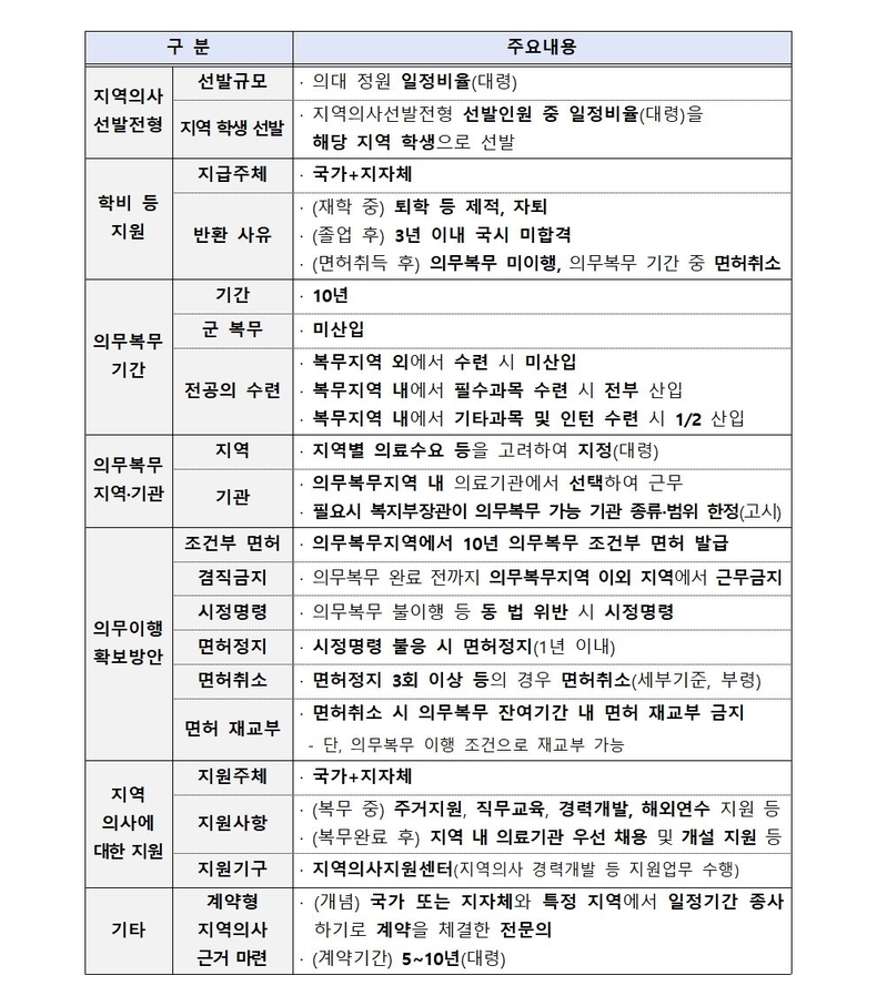 복무형 지역의사는 의과대학 신입생 중 일정 비율을 지역의사선발전형으로 선발해 학비 등을 지원하고, 졸업 후 특정 지역에서 일정 기간(10년) 의무복무하는 의사를, 계약형 지역의사는 기존 전문의 중 특정 지역에서 일정 기간(5~10년) 종사하기로 국가·지자체 및 의료기관과 계약을 체결한 의사를 의미한다.