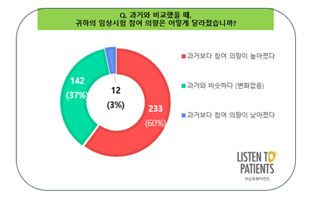 ‘과거와 비교했을 때 임상시험 참여 의향이 어떻게 달라졌는가’라는 설문에는 △과거보다 높아졌다: 233명(60%), △과거와 비슷하다: 142명(37%), △과거보다 낮아졌다: 12명(3%) 라고 답해, 61%가 이전에 비해 임상시험에 대한 참여의향이 높아졌다고 답했고, 과거보다 참여의향이 낮아졌다고 답한 응답자는 3%로 나타났다.