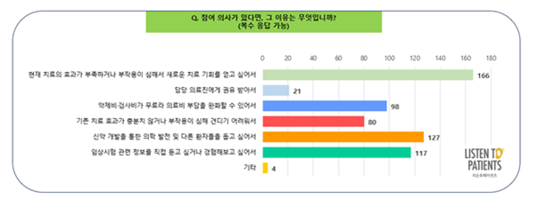 임상시험 참여 의향이 있는 이유를 묻는 설문에는 △현재 치료의 효과 부족 또는 부작용으로 새로운 치료기회를 얻고 싶어서/166명 △신약개발 및 의학 발전에 기여하고 싶어서/127명 △임상시험 정보를 직접 듣거나 경험해보고 싶어서/117명 순으로 답했다.