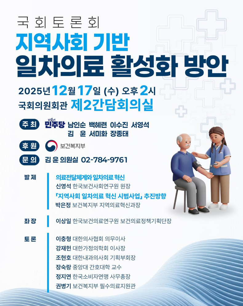 국회 보건복지위원회 소속 김윤 의원(더불어민주당, 비례대표)은 오는 17일(수) 오후 2시, 국회의원회관 제2간담회실에서 ‘지역사회 기반 일차의료 활성화 방안 마련을 위한 국회 토론회’를 개최한다. 이번 토론회는 더불어민주당 남인순·백혜련·이수진·서영석·김윤·서미화·장종태 의원이 공동주최한다.