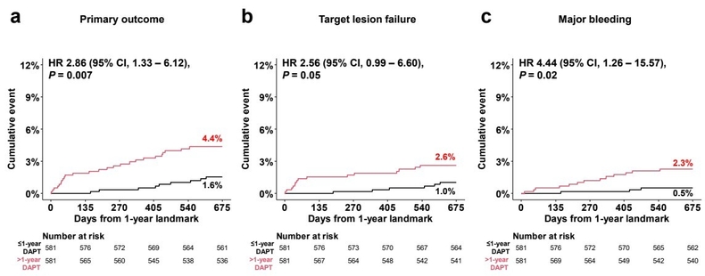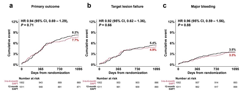 연구 결과, 단기투약군은 장기투약군 대비 장기적 효과와 안전성에서 차이가 없었다. 1차 평가 지표로서 심장관련 사망, 목표혈관 심근경색, 목표병변 혈관재개통술, 스텐트 혈전증, 주요 출혈을 포함한 ‘순 임상사건 발생률’은 단기투약군과 장기투약군이 각각 7.7%, 8.2%로 유사했다. 또한, 2차 평가 지표인 목표병변실패 발생률(치료 효과), 주요 출혈 발생률(안전성)도 유의미한 차이가 없었다.