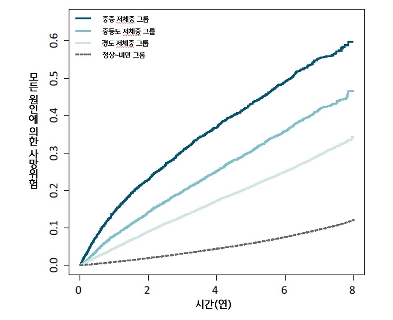 분석 결과, 저체중 그룹의 사망위험은 저체중이 아닌 그룹(정상~고도 비만)에 비해 최대 3.8배 높았다. 그룹별로는 경도 저체중은 2배, 중등도 저체중은 2.7배, 중증 저체중은 3.9배 높은 것으로 나타났다. 사망원인별 분석에서도 저체중 그룹은 당뇨병, 심혈관질환, 뇌혈관질환에 의한 사망률이 모두 1.9~5.1배 높았다.