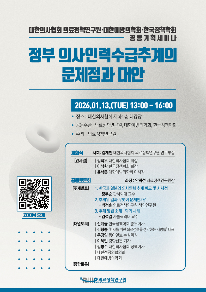 대한의사협회 의료정책연구원은 대한예방의학회, 한국정책학회와 함께 13일 화요일 오후 1시부터 대한의사협회 회관 지하 1층 대강당에서 ‘정부 의사인력수급추계의 문제점과 대안’ 공동 세미나를 개최한다.