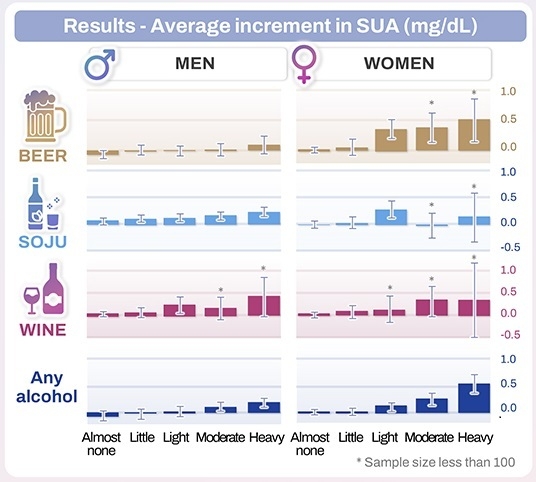 분석 결과, 소주·맥주·와인 모두 음주량이 증가할수록 혈청 요산 수치가 상승하는 경향을 보였지만 요산 증가와 더 강하게 연관된 술의 종류는 성별에 따라 달랐다.