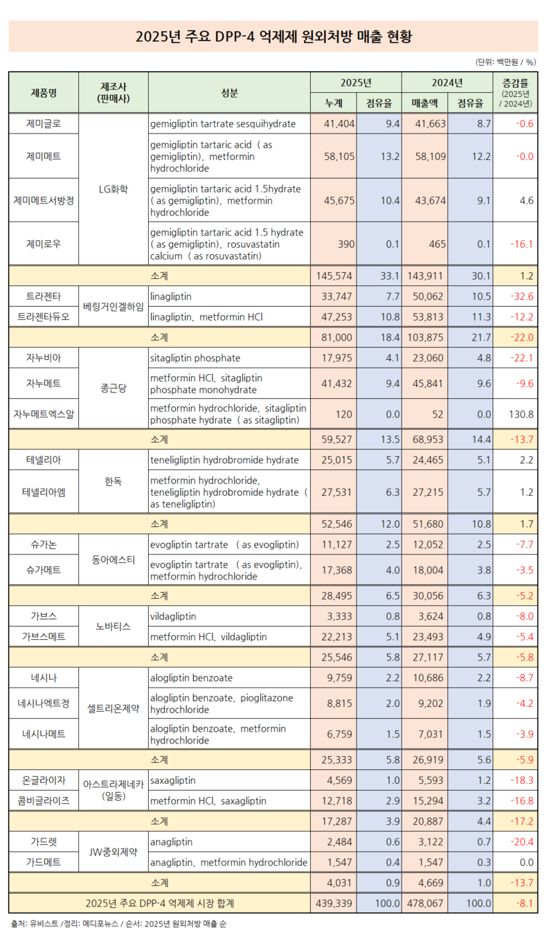 2025년 주요 DPP-4 억제제 시장 원외처방이 2024년 대비 약 8% 감소했다.