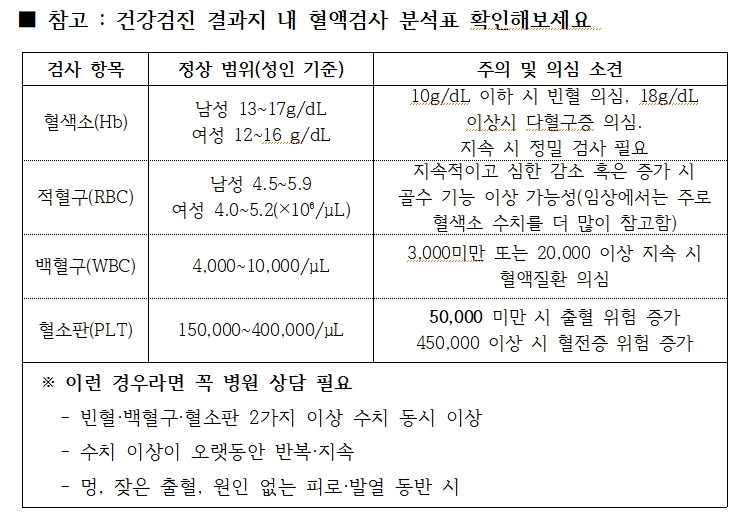 서정호 교수는 “평소와 다르게 이러한 증상이 지속된다면 혈액검사(CBC, 전혈구 검사)를 권장한다”며 “혈액 속 적혈구, 백혈구, 혈소판의 수와 형태를 확인하는 기본 검사로 비교적 간단하지만, 수치 이상이 발견될 경우 증상이 뚜렷하지 않은 초기 혈액암의 중요한 단서가 될 수 있다”고 말했다.