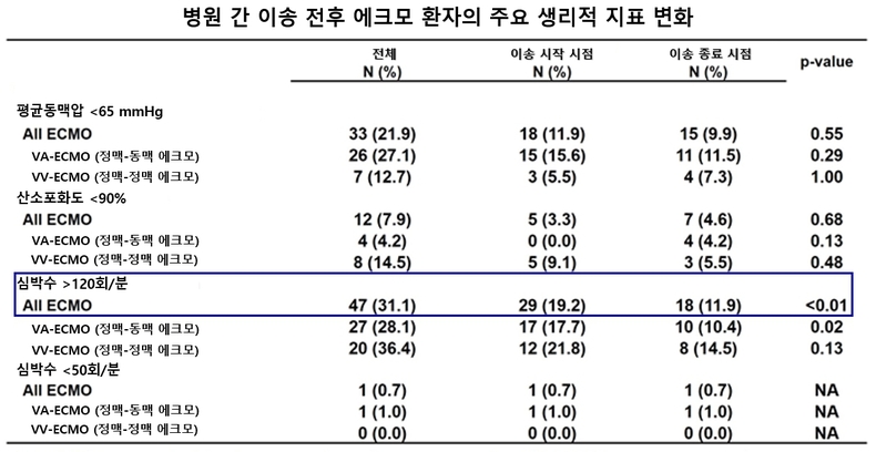 에크모 치료를 받는 환자는 상태가 극도로 불안정한 경우가 많아 병원 간 이송 자체가 큰 위험 요소로 여겨져 왔다. 그럼에도 불구하고, 병원 간 이송 중 환자의 생리적 상태 변화를 이송 전후로 비교해 안전성을 평가한 근거는 그동안 충분하지 않았다.