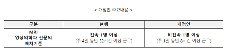 현행 시행규칙에 따르면 MRI 설치·운영하려는 의료기관은 영상의학과 전문의를 두고 주 4일, 32시간 이상 전속으로 근무하도록 해야 한다. 그러나 최근 MRI 설치와 검사건수가 늘어나면서 영상의학과 전문의 구인난이 심화됐고